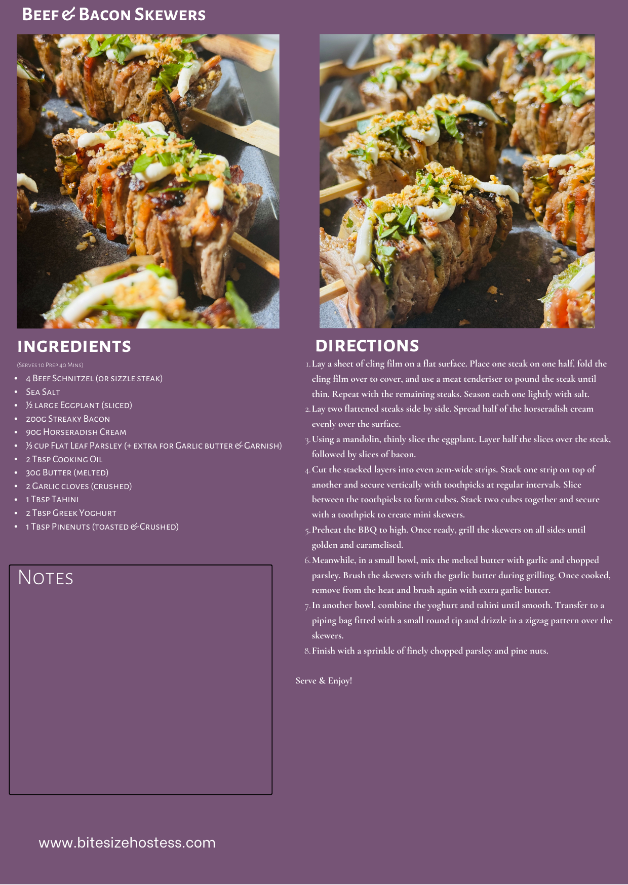 Beef & Bacon Skewers July 13, 2025July 14, 2025 FacebookTweetPin2Email BBQ Party kebabs: When you’re feeding a crowd, the goal is always the same- something easy to prepare, simple to serve, and packed with flavour…BBQ Party kebabs are a crowd favourite. These layered beef skewers tick every box. Each skewer is built from thin slices of beef steak, tenderised for that perfect bite. With a generous swipe of horseradish cream, thin layers of eggplant, and salty strips of bacon, each mouthful is savoury, smoky, and hearty enough to satisfy. Once the layers are stacked and skewered, they hit the BBQ for a quick sear on all sides until golden and slightly charred. The smell of these bbq party kebabs alone will have your guests circling. While the skewers are still hot, they’re brushed with a garlic butter that soaks into the grilled layers and adds an aromatic richness. Just before serving, I drizzle over a tahini yoghurt blend- smooth, nutty, and tangy– and finish with a generous sprinkle of pine nuts and finely chopped parsley. That little drizzle brings a cooling, creamy element that balances everything beautifully, and the pine nuts add a satisfying crunch and a bit of toasted nutty flavour. Not too much fuss, certainly no cutlery required- bbq finger food… just grab, bite, and enjoy. Every Australian enjoys a barbecue & these flavours are familiar, yet just a little different. The horseradish adds a creamy kick without being overpowering, the eggplant melts into the beef, and the bacon brings that irresistible crisp edge. The tahini yoghurt and pine nuts on top? They tie it all together with a creamy, nutty finish & I suggest you make extra as people will be coming back for seconds. Whether you’re putting together backyard bbq finger food, for casual hosting, or just looking for something a little different, these skewers are a crowd-pleaser worth bookmarking. They look impressive, taste incredible, and are easy to prep ahead- just fire up the grill when you’re ready. So next time you’ve got friends around and the barbecue is calling, try stacking your flavours. These bbq party kebabs might just make a regular appearance at your social gatherings. Beef & Bacon Skewers (Serves 10 Prep 40 Mins) You Will Need: Beef Schnitzel (or Sizzle Steak)These are thin, tender cuts of beef that cook quickly- perfect for layering in appetisers or skewers. Choose schnitzel for a slightly thicker, crumb-coated option or sizzle steak for a faster, leaner sear. Sea SaltUse a good quality flaky or fine sea salt to enhance all the savoury elements without overpowering them. EggplantSlices of eggplant grilled or pan-fried until golden and tender. The soft texture and subtle earthy flavour work beautifully with the meat and creamy components. Streaky BaconCrispy and salty with plenty of fat to add richness. Choose a smoky variety if you want a deeper flavour contrast with the other ingredients. Horseradish CreamPunchy, creamy and sharp- horseradish cream adds a fiery little kick that brings the dish to life…but not too much heat. I use Masterfoods brand which is pretty mild but still adds a nice flavour. Look for a ready-made horseradish cream or you can make your own if you prefer. Flat Leaf ParsleyYou have to have a herb (or 2)…for flavour! Flat leaf parsley is Fresh and slightly peppery, brings a clean, herbal note that brightens the dish and of course adds colour. I finely shred it. You need enough for on top of the horseradish, but also extra for the garlic butter and a little more for the garnish. I’m quite liberal with parsley but a medium- sized bunch, I would suggest. Cooking OilA neutral oil with a high smoke point like vegetable, grapeseed or rice bran oil is ideal for searing the beef and eggplant without altering the flavour. ButterA knob of butter to baste the beef during cooking & added at the end of cooking, adds flavour and a golden finish to the skewers. GarlicUse fresh garlic cloves, finely chopped or crushed, to flavour the oil or butter during cooking for a subtle aromatic base. I put it in the melted butter. TahiniTahini is a rich sesame paste with a creamy texture and nutty depth- often used in hummus but used here as part of a drizzle or dressing, and is combined with yoghurt. Greek YoghurtI really love Greek yoghurt, its thick, tangy and cooling (so perfect with spicy ingredients- Greek yoghurt balances the bold flavours so works beautifully with tahini for a luscious drizzle or dip. PinenutsLightly toasted to bring out their natural sweetness and crunch. These little gems add texture and a touch of luxury to finish off the dish. I smash some (you can toast first in a pan, but I also keep some whole really just for texture. Instructions: Prepare the Schnitzel For these BBQ Party kebabs, start by laying a sheet of cling film flat on your bench or chopping board. Take one piece of beef schnitzel or sizzle steak and place it on one half of the cling film. Fold the other half of the cling film over the top to cover it completely- this helps contain any mess and makes the pounding process a little cleaner. Using a meat mallet or tenderiser, gently pound the steak until it’s nice and thin-around 3–4mm is ideal. You’re aiming for an even thickness so the steak cooks quickly and evenly. Repeat this process with the remaining steaks. Once all are flattened, lightly season each one with a pinch of sea salt. Layer the Ingredients Take two of the flattened steaks and lay them side by side, slightly overlapping on a clean surface to form a wide, single layer. Spread half of the horseradish cream evenly across the surface using the back of a spoon or a spatula- it doesn’t need to be thick, just a light, even coating to give a bit of heat and creaminess. Follow this with a generous sprinkling of chopped parsley. Now, using a mandolin (or a very sharp knife), slice the eggplant into thin rounds- about 2mm thick. Lay half of the eggplant slices over the steak, overlapping sl
