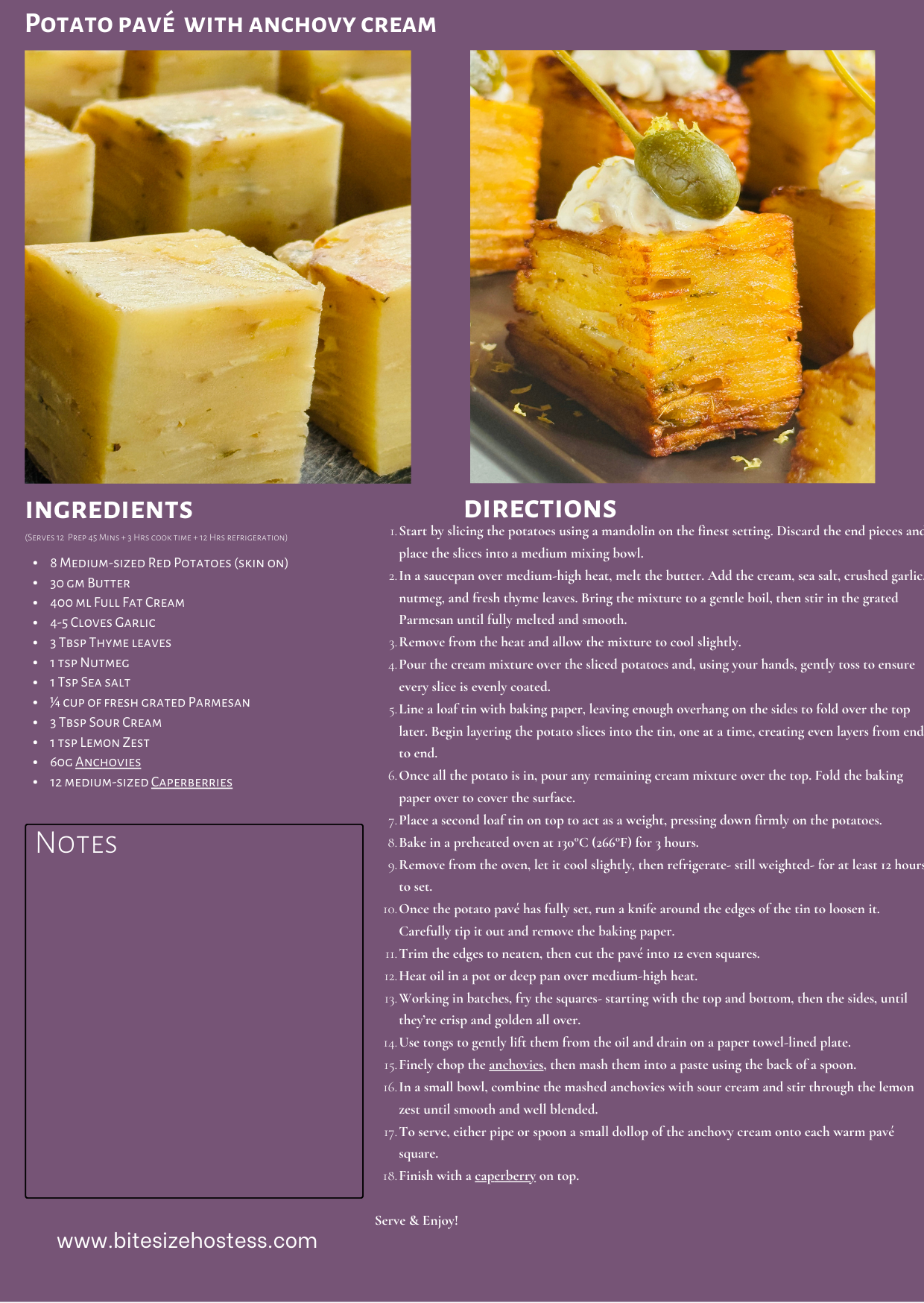 Potato Pavé With Anchovy Cream May 26, 2025June 30, 2025 Facebook12TweetPin6Email Chip & Dip to Chic & Dip: There’s something timeless about chips and dip, the sort of comfort finger food that shows up to every occasion…BBQs, mezze spreads, grazing boards, casual platters, even formal tables trying to loosen things up a little. Its familiar, effortless, and always a crowd-pleaser. No matter the age group, there’s definitely something comforting about that crispy crunch paired with a creamy dip. But what if you want to give it a visual glow-up? Don’t get me wrong…I’m all for easy entertaining, and chips and dip absolutely fall into the “no-effort, no-fail” category. But when you want to take the same idea and make it feel exceptional (without breaking the budget or your back), there’s a clever way to do just that. Introducing Potato Pavé Sometimes called “million-layer potato”, this French classic might sound fancy, but it’s easily attainable for the average cook. Thin slices of potato are layered with butter, cream, herbs & spices, baked, pressed, then crisped up into perfect bite-sized pieces. Think of it as the elevated cousin of the humble chip…crisp on the outside, buttery on the inside, and absolutely irresistible. Sounds alot & even though it requires 3 hours baking & overnight refrigeration, it is surprisingly simple to prepare but it does need to be prepped the night before, so may require some forward-planning. The best part? This comfort finger food pairs beautifully with any dip. From classic sour cream and chive, to something a little more gourmet like whipped feta with herbs, truffle aioli, or a silky caramelised onion dip…potato pavé carries it all with style. I have used an anchovy cream which adds a nice flavour contrast but with a simple flavour base, you create a blank canvas for adding whatever flavours take your fancy. Suddenly, you’ve taken a backyard snack and turned it into an elegant canapé. A tray of these layered golden crisps, topped with a quenelle of dip or served with a pot for dunking, instantly becomes the kind of appetiser people talk about for days to come. It’s still comfort finger food, but dressed up for the occasion. So next time you’re planning your party table or catering board, consider giving your chips and dip a makeover. A little effort, a lot of reward…and still just as loved by young and old. Potato Pavé With Anchovy Cream: (Serves 12 Prep 45 Mins + 3 Hrs cook time + 12 Hrs refrigeration) You Will Need: Red Potatoes The base of this comfort Finger food, red potatoes have a smooth, thin skin and a waxy texture, making them ideal for layering in dishes like potato pavé. They hold their shape well after cooking, creating those beautiful, defined layers without becoming too starchy or mushy. You want medium-sized potatoes. Unsalted Butter A key player in creating that golden, crisp exterior and rich interior. Using unsalted butter gives you control over the seasoning, and its pure, creamy flavour enhances the potatoes without overpowering them. Full-Fat Cream For silky, luxurious texture and depth. Full-fat cream binds the potato layers while adding richness…an essential element in transforming a humble potato into a decadent bite. Garlic Cloves Gently infused into the cream or butter, garlic adds warmth and savoury depth. It complements the potatoes without stealing the show…just enough to make guests wonder what that delicious undertone is. Fresh Thyme Earthy and aromatic, thyme brings a subtle herbaceous note that works beautifully with potatoes, garlic, and cream. It’s fresh, elegant, and unmistakably inviting. You do want to make sure that you pull the leaves off and leave behind the stems as much as possible. Nutmeg Just a whisper of freshly grated nutmeg goes a long way. It adds a gentle warmth and complexity to the cream mixture…one of those secret ingredients that enhances everything without being obvious. Sea Salt Essential for seasoning this dish. Flakey or fine sea salt ensures that the potatoes are well-flavoured throughout, not just on top. Parmesan Ah…everything tastes better with Parmesan! Finely grated fresh Parmesan cheese brings a salty, umami richness. It also helps crisp up the edges, adding that irresistible golden crust to your pavé. Vegetable Oil I have made these using both vegetable oil & coconut oil. I like the taste of the coconut oil but as long as it is a hish smoke point oil. Sour Cream A cooling, tangy contrast to the rich pavé. It works beautifully as a dip base or as a quenelle garnish on each square & it is light to help balance the cream. The acidity is what cuts through the butter and cream for perfect balance. Lemon Zest Bright and citrusy, lemon zest lifts the entire flavour profile. It adds freshness to the sour cream and complements the salty anchovies and capers. Anchovies Just a little can add a punch of umami and saltiness. Its always more economical to buy the large jars of anchovies. They last for a while in the fridge and are great in salads or pastas as well. Finely chopped the mashed and folded into the dip or used as a bold garnish, anchovies balance the creaminess and elevate the whole dish with Mediterranean flair. Caperberries (Garnish) Caperberries are just that little bit more luxe than capers, even though they are not an expensive item…depending where you buy them. Bigger and milder than capers, these beautiful, briny berries make a stunning garnish. Their vinegary tang and slight crunch are a perfect finishing touch…eye-catching and flavour-popping. Instructions: Prepare the Potatoes Don’t worry about washing the potatoes. You want the maximum ‘glue effect’. Using a mandolin on its finest setting, carefully slice the potatoes into thin, even slices. This helps create those beautiful, defined layers when baked. Discard any uneven or end pieces that won’t layer well. Place the slices into a medium mixing bowl and set aside. Mak