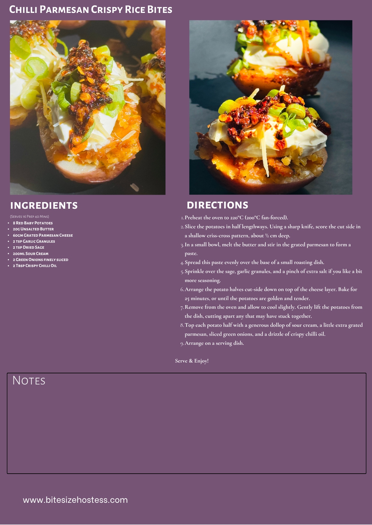Chilli Parmesan Potato Bites August 10, 2025August 10, 2025 Facebook2TweetPin4Email Memorable Appetisers- For The Love Of Potato: Memorable appetisers don’t necessarily need fancy ingredients, nor be boring and predictable…the good old potato can shine with the best of them. Let’s be honest- potato is always a good idea. Mashed, boiled, roasted, scalloped, fried…whatever the format, it sings to my heart every single time. But, and there is a but, potatoes aren’t the most healthy of vegetables, so even though I love them, I don’t often eat them to be honest. As an appetiser ingredient however? Well, the world is your oyster. So many options here for topping and they are such a popular ingredient, especially for entertaining. You can keep things simple or go all out with flavour, and it will always deliver. On top of that, they are super cost effective, so again, a great option for crowds. Why not swap out the regular bag of chips for more memorable appetisers like these baked potatoes. This particular little number…encrusted in a buttery parmesan crust that clings to all those crackly edges. Once they’re out of the oven, they’re loaded up with cooling sour cream, a fresh hit of green onion, a second hit of parmesan (because why not?), and a spoonful of crispy chilli oil to bring a little kick and crunch to the party. Honestly, they don’t last long, they vanish in seconds, especially if you’ve got a hungry crowd hovering nearby. You could blink and the tray’s half empty- consider that your warning! 😉 Why I Love These: Big flavour, low effort. The roasting does most of the work, and the toppings come together in minutes. It’s very hands-off, which I always appreciate when prepping for a gathering. Filling and satisfying. These memorable appetisers aren’t your dainty, one-bite nibbles- they’ve got a bit of weight to them, which makes them perfect for pre-dinner grazing or standing-in-the-kitchen kind of moments as well as passing around a crowd in your backyard or lounge room. Built for a crowd. This recipe scales beautifully. Just roast more potatoes and keep the toppings flowing. I’ve done them for casual get-togethers and larger parties, and they hold their own every time. Make-ahead friendly. You can roast the potatoes earlier in the day, reheat just before serving, and let guests load up their own toppings if you’re feeling interactive. Tips for Success: Choose small to medium potatoes (chat or baby golds are great). You want something with a nice surface area for all that buttery parmesan to cling to. Be Generous with the butter and cheese. Don’t be shy here. This is the best bit. The butter helps the parmesan stick and caramelise, giving you that irresistible golden crust. Serve warm. These are definitely best when the cheese is crisp and the sour cream just starts to melt into the heat of the potato. Add that chilli oil right before serving for the full effect. Make It Yours: This recipe is a beautiful base to build on. You could swap the sour cream for crème fraîche or Greek yoghurt, use chives instead of spring onions, dial up the heat with extra chilli oil or a few chopped pickled jalapeños or add crispy bacon bits. You could even add a sprinkle of crispy bacon or smoked paprika for another layer of flavour. These memorable appetisers may not suit you for a cocktail do, but you could very easily change the topping up to piped sour cream, with salmon roe or edible flowers or piped salmon cream with capers & dill. Potatoes have this incredible way of being both comforting and exciting at the same time, and I think this dish really leans into that. They’re familiar enough to please just about every population, but with a little twist that gives them more status. These are everything I love in memorable appetisers- tasty, easy, and ready to feed a crowd. And honestly? They’re just plain yum! So, if you’re after something a little indulgent, a little spicy, and a lot delicious, try these crispy parmesan roasted potatoes. Don’t expect leftovers! Chilli Parmesan Potato Bites (Serves 16 Prep 40 Mins) You Will Need: Red Baby Potatoes Use washed potatoes & Small ones, 5-6cm in diameter. The baby ones are tender, no peeling required, just halve and score for maximum flavour. Unsalted Butter: I use unsalted butter. This forms the base of the parmesan crust. Using unsalted butter lets you control the seasoning to your taste. Grated Parmesan Cheese: Salty, nutty, and full of umami, parmesan melts into the butter to create a golden, savoury crust on the potatoes…so delicious. You can use the ready grated parmesan from the supermarket or finely grated from the block. Garlic Granules: Garlic granules are just easy, they add a gentle, roasted garlic flavour that blends perfectly with the cheese and butter. But alternatively, you could use crushed fresh garlic. I always find it easier to just sprinkle the garlic granules myself. Dried Sage: Any herbs are ok. Dried sage is earthy and aromatic, it infuses the potatoes with a subtle herbal warmth. You could use use rosemary, oregano or basil or even mixed herbs. Sour Cream: Sour cream is cool, creamy, and tangy & the perfect topping to balance the richness of the crispy parmesan layer. Greek yoghurt or crème fraîche could be another option, if you want something a little lighter. Green Onions, Finely Sliced: The green onions are for garnish. They are fresh and mild, adding a pop of colour and a crisp bite to finish the dish. Crispy Chilli Oil: A final flourish of heat, crunch, and deep chilli flavour that takes these potatoes from comforting to completely addictive with crispy chilli oil. The one I buy is from Coles or Woolies…Both stock it & so does the Asian store. It is Lao gan ma spicy Chilli crisp (670g jar). Instructions: Preheat the oven Preheat the oven to 220°C (200°C fan-forced). Position the oven rack in the middle so the potatoes cook evenly and develop that perfect golden crust. Pre