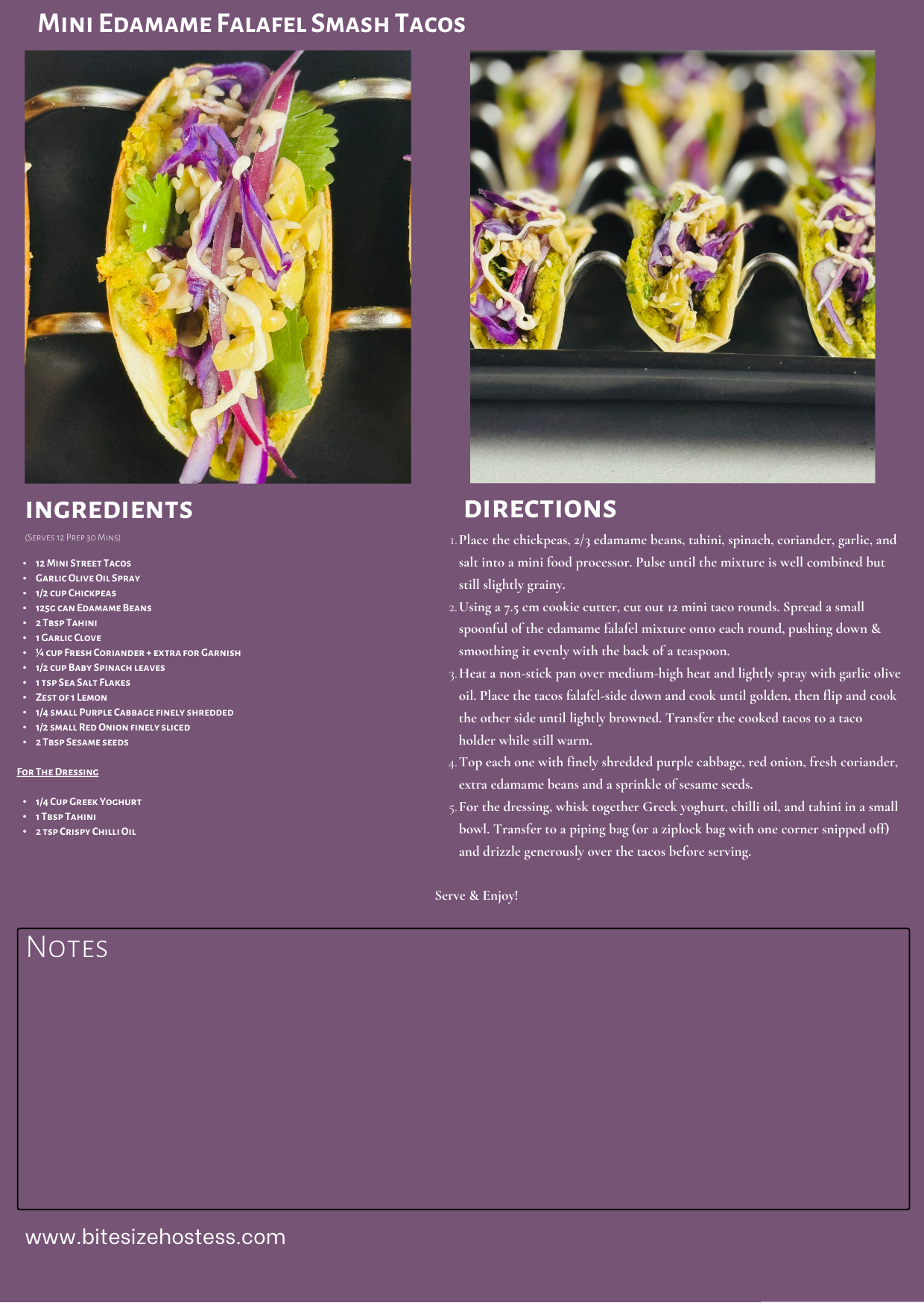 Base Flavours for your mini smash tacos include: edamame, chickpeas, tahini, spinach, coriander, garlic.
