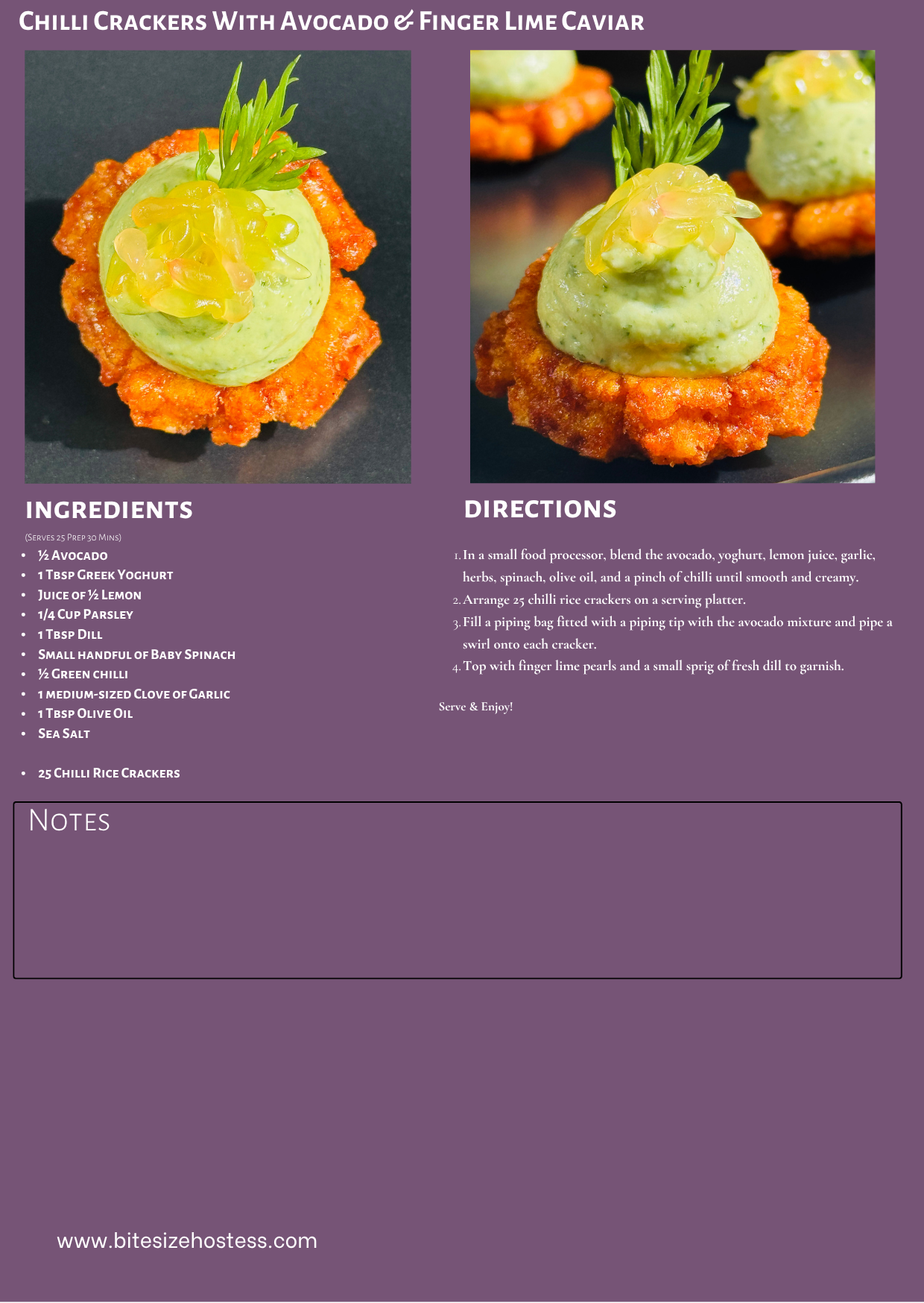 Chilli Rice Crackers With Avocado & Finger Lime Caviar July 28, 2025July 28, 2025 Facebook15TweetPin11Email One Bite Appetisers: Entertaining doesn’t have to be bigger than Ben Hur, in fact, some of the most enjoyable get-togethers I’ve hosted have been the most relaxed- no extravagant spreads, no marathon cooking sessions, just a few one bite snacks, good wine, and people I enjoy being around. That being said though, I do so enjoy going that extra mile and being the hostess with the mostess But the truth is, you don’t need to go over the top to impress. Often, it’s the simple one bite appetisers, done with a little care and attention, that make guests feel like they’re loved and appreciated. And let’s be honest, who doesn’t love a good snack with a little flair? Take an everyday snack like these chilli rice crackers, for example. They’re small, punchy, and full of flavour & great all on their own- spicy, crisp, and perfectly moreish. But instead of serving them in a bowl with a store-bought dip on the side (we’ve all done it!), I’ve used them as the base for a quick & clever canapé. It only takes a few minutes to transform these one bite crackers into something that feels a little more curated. I top each crispy cracker with a generous dollop of creamy avocado dip, made with newly ripe avocado, a little green chilli, plenty of fresh herbs, a hit of lemon or lime juice, and a pinch of salt & a sneaky little hint of garlic. The result is cool and fresh- just the right contrast to the heat of the cracker but the avocado just quietens down the spice a little (for those that don’t like spice). To finish things off, I add a little spoonful of citrus caviar (the glistening pearls from finger limes). These one bite canapés are not just pretty- they burst in your mouth with tangy brightness, bringing a fresh lift to the rich avocado and spicy base. Finger lime flesh comes in different colours as well…perhaps an undervalued ingredient? It’s a tiny garnish, but it completely transforms these one bite appetisers into something unexpected & stylish. Simple canapés like these, people remember- not because they’re complicated, but because they are very simply embellished & anyone can do it. Food like this naturally draws people in…breaks the ice…gets them curious and engaged. And as a host, that’s such a win- especially when it takes barely any time to pull together. I love these kinds of one bite snacks for bigger events too. They hold well on a platter, look colourful and vibrant, and don’t require any last-minute fuss and you can make a ton of them to go around to fill the gaps. You can even prep the components ahead of time- make the dip, scoop out the finger lime, then just lay out your crackers and assemble them right before guests arrive. So if you’re feeling the pressure to create something grand for your next gathering, take a breath & consider light bites like these. One bite appetisers don’t have to be extreme. Start with a humble ingredient like a rice cracker- and think of how you can build on it with texture, colour, and flavour. A little creamy dip, a citrus pop, and a spicy crunch- and suddenly, you’ve got an appetiser that feels thoughtful, modern, and completely crowd-pleasing. Keep it simple. Keep it punchy. Let your appetisers do the talking- one tiny bite at a time. Chilli Rice Crackers With Avocado & Finger Lime Caviar (Serves 25 Prep 30 Mins) You Will Need: Avocado I use a barely ripe avocado with its creamy flesh and a mild, buttery flavour. It is a personal thing. I don’t like fruit or veges that are fully ripe. Obviously it needs to have a bit of give to blend but just make sure its still firm. Avocado forms the base of the dip, & even though its rich, the flavour is mild but the other elements give it a boost. Greek Yoghurt Thick and tangy, Greek yoghurt brings a lightness and subtle tang to balance the richness of the avocado. It also helps the mixture hold its shape when piped onto crackers. Lemon Juice Freshly squeezed lemon juice brightens the entire dip, adding acidity and freshness. It also helps preserve the vibrant green colour of the avocado. Lime juice is another option but since there is finger lime on top, I havve used lemon juice in the dip. Parsley Any parsley is fine, I use flat-leaf & it adds clean, herbaceous notes and a touch of earthiness to the mix. It’s a fresh counterpoint to the richness of the other ingredients. Dill Fresh dill brings a bright, slightly grassy flavour with subtle notes of anise. It adds a fragrant lift to the avocado dip and works beautifully as a garnish, offering both visual appeal with it’s feathery appearance and a fresh, herbaceous contrast. Use the soft fronds rather than the thicker stems for the best flavour and presentation. Green Chilli A small amount of fresh green chilli adds a gentle heat and a lively kick to the mix. A different heat to the crackers…It enhances the flavour without overpowering the other ingredients. You can leave this bit out if you don’t want any more spice but 1/2 a chilli won’t be particularly hot. Baby Spinach A small handful of baby spinach helps boost the colour and adds a very subtle earthiness. Garlic Just a single clove is enough to add depth and savoury warmth. Raw garlic can pack a punch, so use it sparingly to enhance without overpowering. Although I am often heavy- handed with garlic, I have shown restraint on this occasion, using only 1 medium-sized clove. Olive Oil A drizzle of good-quality olive oil brings everything together, adding smoothness and a subtle peppery note. It also helps the dip emulsify to a creamy, pipeable consistency. I use garlic- infused olive oil. Salt A pinch of sea salt flakes it generally enough but you can titrate it to your taste. Chilli Rice Crackers I just bought a bag of chilli rice crackers at a Brisbane food market (Harris Farm). I have seen them in Asian supermarkets and at IGA too. There would have b