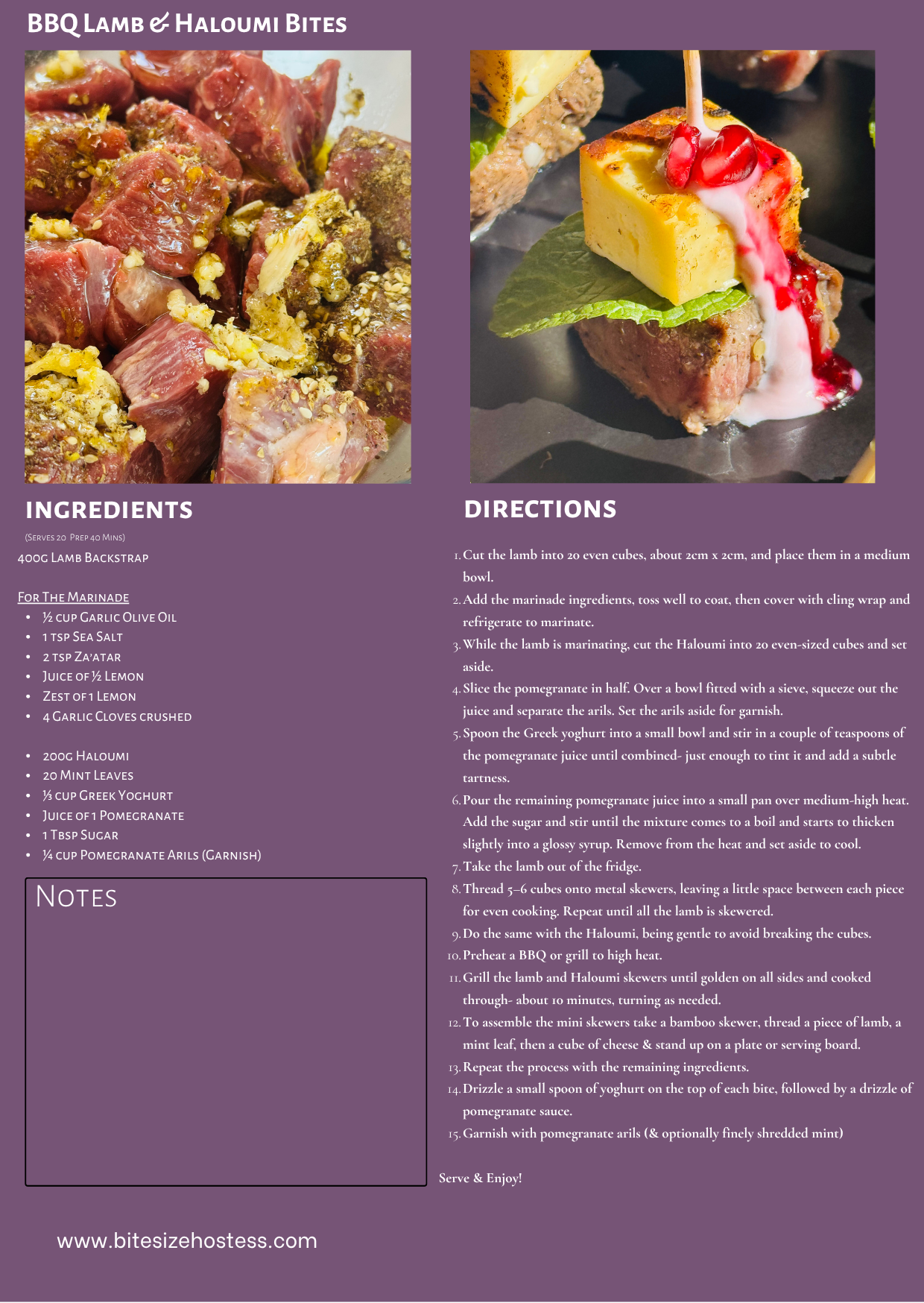 BBQ Lamb & Haloumi Bites June 18, 2025June 18, 2025 Facebook5TweetPin2Email Mediterranean Finger Food: I absolutely love lamb and Haloumi together & when preparing tasty party skewers, this pairing just makes my heart sing. Rich, savoury lamb paired with salty, golden-fried Haloumi is already a flavour match made in heaven. But when you bring in a few classic Mediterranean friends like garlic, lemon, Greek yoghurt, mint, pomegranate, and za’atar? Well… it becomes so much more than just a nibble, it becomes the ultimate temptation. Just the thought of these flavours makes my mouth water. There’s a certain charm in keeping things small and intentional- just a mouthful, but one that lingers in the memory. These flavourful party bites are fresh, smoky, charry, juicy, creamy, zesty, and just a touch indulgent– everything you will love in an appetiser. I’ve been making appetisers for a long time- more than two decades in fact, and one thing I always come back to is this: simple ingredients, served thoughtfully, always shine. Especially when you shrink them down to a single, flavour-packed bite. And the main feature? These tasty party skewers are easy. Genuinely. If you can BBQ (grill), stir, and stack, you can make these. Anything you can imagine throwing on the BBQ, chances are it can be turned into an appetiser or mini cocktail canapés. A Bite That Tells a Story These lamb and haloumi bites are inspired by some of my favourite Mediterranean memories & when I serve these tasty party skewers, I feel like I’m bottling up that atmosphere and offering it to guests, one little bite at a time. Bites that tell a story deliver so much more & everyone loves a good story. BBQ Lamb Haloumi Bites (Serves 20 Prep 40 Mins) You will Need: Lamb BackstrapLean, tender, and quick to cook, lamb backstrap is a beautiful cut that stays juicy and delivers bold flavour. Perfect for grilling or searing- and ideal for bite-sized skewers. Garlic Olive OilInfused with mellow garlic flavour, this oil gives a great base for marinades without the raw sharpness of fresh garlic. It adds depth and aroma to the lamb while keeping things simple. Sea SaltA pinch of good-quality sea salt brings out the natural richness of the lamb and balances the salty haloumi. It’s a small detail that makes a big difference. Za’atarThis fragrant Middle Eastern spice blend (typically made with dried thyme, oregano, marjoram, cumin, coriander, sesame seeds, and sumac) adds an earthy, tangy note, perfect with lamb and yoghurt. Lemon JuiceFreshly squeezed lemon juice brightens up the marinade and balances the richness of the meat and cheese. It also helps tenderise the lamb as it marinates. I have used 1/2 a lemon but you could add more. Lemon ZestAdding zest gives that extra punch of citrus without the acidity- it’s vibrant, aromatic, and ties in perfectly with the yoghurt and mint. I have zested the whole lemon as I like a punchy citrus hit. Fresh GarlicA little minced garlic in the marinade brings warmth and depth. It mellows as the lamb cooks and adds to the moreish, savoury flavour. Being a garlic lover, I love a few good cloves here. HaloumiSalty, squeaky and golden when grilled, Haloumi holds its shape beautifully and makes the perfect counterpoint to the juicy lamb. Its rich texture and briny flavour are made for entertaining. Mint LeavesFresh mint adds a cool, herbal note that lifts the whole bite. Tucked between the lamb and haloumi, it adds colour and balance, plus that unmistakable freshness. Greek YoghurtThick, creamy, and tangy, Greek yoghurt is the perfect base for a light sauce. It adds a cooling contrast to the grilled skewers and carries the pomegranate flavour beautifully. Pomegranate JuiceNaturally tart and slightly sweet, pomegranate juice is used two ways here- stirred through yoghurt for a subtle tang a colour tint, and reduced into a syrup for a glossy drizzle. SugarJust a touch added to the pomegranate juice helps balance the tartness and turns the juice into a shiny, lightly sweetened syrup for finishing. Pomegranate ArilsJuicy bursts of sweetness with a hint of crunch the arils are used as a garnish, adding colour, texture, and a beautiful pop of flavour in every bite. Instructions: Dice the Lamb: Start by cutting the lamb into 20 even cubes, roughly 2cm x 2cm in size, and place them in a medium mixing bowl. The goal is to keep the pieces similar in size so they cook evenly. Marinate the Lamb: Add your marinade ingredients to the bowl- garlic, lemon juice, lemon zest, olive oil, za’atar, salt and toss the lamb well to ensure each piece is nicely coated. Cover the bowl with cling wrap and place it in the fridge to marinate. Ideally, give it at least 20 minutes, but longer is always better if time allows- even overnight if you’re prepping ahead. This allows for more flavour to develop. Dice the Haloumi: Haloumi comes in different sized packs but while the lamb is soaking up all that flavour, slice your Haloumi into 20 even-sized cubes and set them aside. Keep them chilled if it’s a warm day- Haloumi holds its shape better straight from the fridge when threading. It alsos doesn’t melt the same as other cheeses. I call it the squeaky cheese as it squeaks as you chew it. Prepare the Pomegranate: Cut it in half and, working over a bowl fitted with a sieve, squeeze out the juice using your hands. Let the juice collect in the bowl while the seeds (arils) are caught by the sieve- pick out any stray bits of membrane and set the arils aside for garnish. You’ll be using the juice in both the yoghurt and the syrup, so don’t waste a drop. Flavour the Yoghurt: Spoon the Greek yoghurt into a small bowl…about ½ cup works well- and stir in a couple of teaspoons of the fresh pomegranate juice. This adds a beautiful pink tint and a subtle tang that works so well with the rich lamb and salty cheese. Mix until smooth and set aside. Make the Pomegranate syrup: Pour the remaining pomegranate juice into a small s