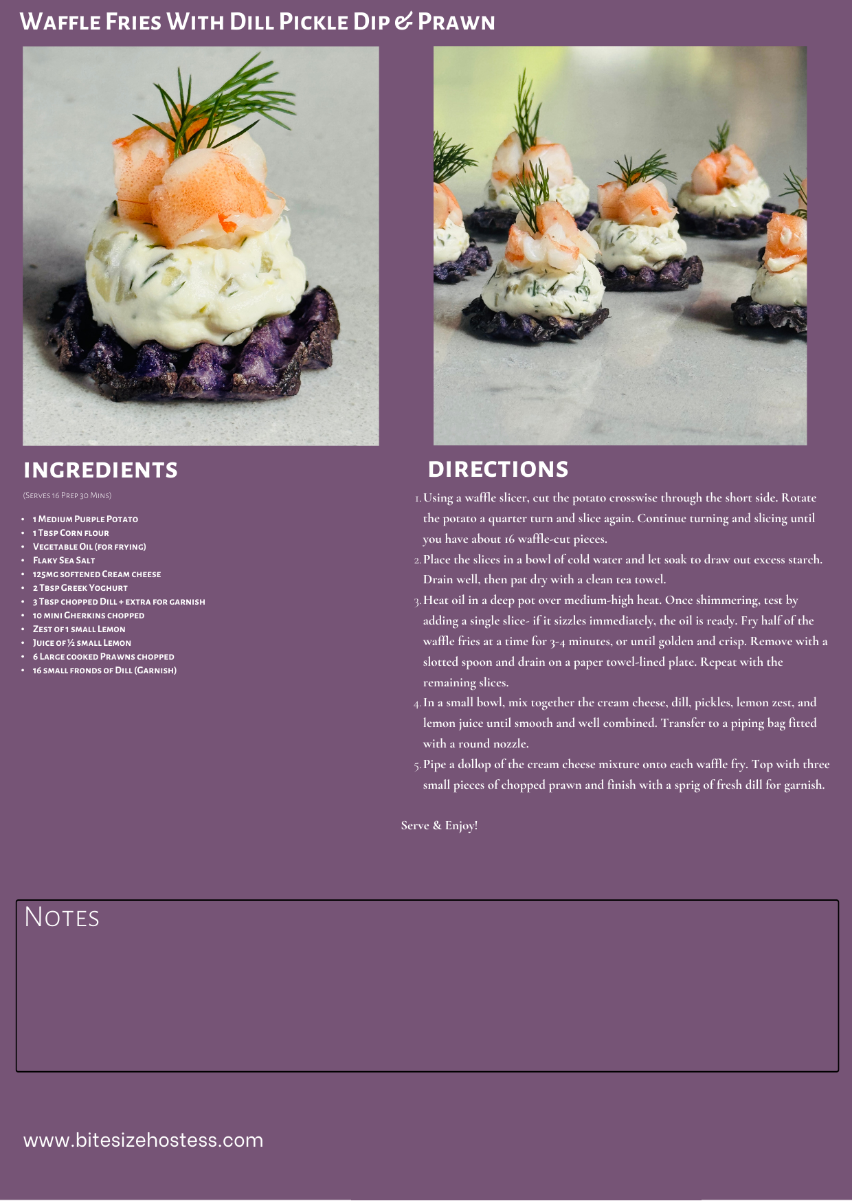 Waffle Fries With Prawn & Pickle September 15, 2025September 15, 2025 Facebook17TweetPin5Email Waffle Fry Party Bites: Sometimes appetisers need a little drama, and nothing delivers quite like waffle fry party bites. Instead of your everyday golden spud, try coloured potatoes- suddenly you’ve got a chip that looks like it’s dressed for a party. I recently picked up some midnight purple potatoes at the farmer’s market, and they were too pretty not to play with- you could do the same thing with sweet potato. Once sliced into waffle fries, the purple potato crisped up with this gorgeous jewel-toned hue that instantly stole the show on the platter. To keep the toppings snappy, I whipped together a dill-and-pickle dip- bright, tangy, and a little herby. I cut up prawn on top but you could add a vegetarian or vegan topping such as pesto, sun-dried tomato or marinated artichoke. The waffle cut potato chip is your blank canvas: swap in salmon, prosciutto, or even a dollop of whipped feta if you’re not in the mood for prawns. You don’t necessarily need a lavish topping for this simple canapé, just a dollop of crème fraîche & some fresh herbs can be enough. The coloured potatoes do half the work for you- they’ve got that instant “wow” factor. This appetiser isn’t about complicated cooking; there is some cooking involved but it is pretty simple. It’s about making something that tastes great, looks striking, and makes people reach for “just one more.” Waffle Fries With Prawn & Pickle (Serve 16 Prep 30 Mins) You Will Need: Purple Potato: Midnight purple potatoes (sometimes called Peruvian or heirloom varieties) are not only striking to look at but also hold their shape beautifully when fried. Their jewel-like colour make the waffle-cut chips feel instantly special. I found mine at the local farmer’s market. Corn Flour: A light dusting of corn flour (cornstarch) before frying helps wick away surface moisture and creates a delicate, crisp shell around the potatoes. This small step makes a big difference in achieving that irresistible crunch. Vegetable Oil: I have just used vegetable oil for this recipe, it is neutral in flavour and with a high smoke point, vegetable oil is ideal for deep-frying. It allows the potatoes to cook evenly and develop a golden, bubbly texture without overpowering the other flavours. Sea Salt: A sprinkle of flaky sea salt right after frying enhances the natural flavour of the potatoes and balances the richness of the toppings. Always season while the fries are hot so the salt clings perfectly. Softened Cream Cheese: For the creamy element of the dip, I have used cream cheese, adding body and a mild tang that pairs well with both dill and seafood. Softening makes it easier to whip into a smooth, pipeable texture. You don’t want a runny mixture, so the cream cheese works well. Greek Yoghurt: Thick, tangy, and slightly sharp, Greek yoghurt lightens the cream cheese while giving the dip a refreshing lift. It keeps the topping from feeling too heavy and adds a nice balance to the fried base. Garlic Clove: Fresh garlic adds a subtle punch and depth of flavour to the dip. Mince it finely or grate it so it blends smoothly into the mixture. I find 1 clove is not alot but it just adds a little depth of flavour. Fresh Dill: Bright and aromatic with a gentle anise-like note, dill is the hero herb here. It cuts through the richness of the cream cheese and brings a burst of freshness that pairs beautifully with seafood. It would have to be one of my favourite herbs for canapés due to the freshness it brings. Mini Gherkins: Finely chopped gherkins add crunch, acidity, and a playful tang to the cream cheese mixture. They’re the secret ingredient that keeps each bite lively and well-balanced. Lemon Zest: Provides fragrant citrus oils that lift the dip with a sunny brightness. It complements the dill and seafood while keeping the overall flavour light and zippy. Lemon Juice: A squeeze of juice sharpens the mixture and adds just enough acidity to tie all the creamy and briny elements together. Cooked Prawns: Sweet, succulent prawns are the star topping. Chopped into small pieces, they provide just the right amount of seafood flavour, they don’t overpower the potato & I have used precooked prawns to save extra work in the kitchen. Fresh Dill (Garnish): A tiny sprig of dill on top finishes each bite with a fresh herbal note and subtly dresses up the final presentation. Instructions: Cut The Potato Using a waffle slicer, cut the potato crosswise through the short side to form that signature criss-cross pattern. After each cut, rotate the potato a quarter turn before slicing again- this is what creates the lattice texture. Continue turning and slicing until you have around 16 evenly shaped waffle-cut pieces. Try to keep the thickness consistent so that they fry up at the same rate. Soak The Potato Once cut, place the slices straight into a bowl of cold water. This step helps wash away surface starch, which prevents the slices from sticking together and ensures they’ll crisp up beautifully. Let them soak for at least 15 minutes. When ready, drain the potatoes well and pat each slice dry with a clean tea towel. For extra crunch, lightly dust the slices with cornflour before frying- this gives them a delicate coating that crisps as it hits the hot oil. Fry The Chips Heat a deep pot of oil over medium-high heat until it begins to shimmer. To check if it’s ready, drop in a test slice: if it sizzles right away and floats to the surface, you’re good to go. Fry the potatoes in two batches, being careful not to overcrowd the pot. Each batch will need about 3–4 minutes, or until the fries are golden, crisp, and slightly puffed. Use a slotted spoon to lift them out and transfer onto a plate lined with paper towel to absorb any excess oil. Repeat with the remaining slices. Prepare The Topping While the fries cool slightly, make the topping. In bowl of a small processo