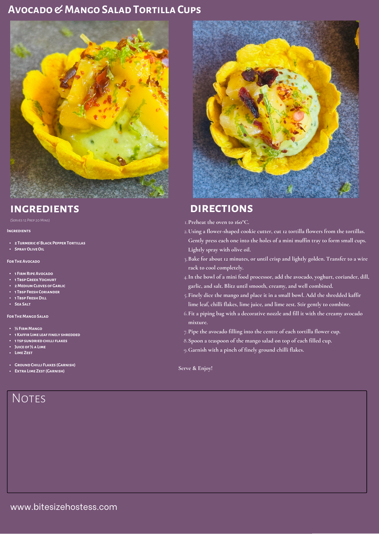 Avocado & Mango Salad Tortilla Cups January 12, 2026January 12, 2026 Facebook16TweetPin2Email Warm-weather Appetiser: When you are the one hosting & you’re craving something fun and fresh with summery vibes, this little warm-weather appetiser might be one perfect option for you. It’s packed with bright flavours, looks gorgeous on a platter, and genuinely takes the pressure off when it is only you in the kitchen. Summer entertaining can feel a bit same-same– the grazing board comes out, someone brings chips, someone else brings dip, and before you know it, the table looks exactly like the last ten events. So why not shake things up with something that still feels easy, but also feels like you put a little thought into it? This recipe is perfect for that. Most of the elements can be prepped in advance: the mango salad can chill happily in the fridge, the avocado mixture holds beautifully with a little citrus, and the tortilla cups can be made hours ahead. When your guests start to trickle in, all you need to do is assemble and serve. It’s that kind of breezy hosting that makes you look like you’ve got everything under control-even if the rest of the kitchen is chaos. (We’ve all been there.) This warm weather appetiser brings brings that smooth, buttery avocado base, and the addition of mango salad adds the perfect contrast-sweet, juicy and brightened with citrus zest, a squeeze of lime, and aromatic (kaffir) leaves that give it a lift you don’t normally get from a simple salsa. It hits all the right notes: a little creamy, a little tangy, a little sweet, and completely refreshing & makes my mouth water every time. And the best part? Adorable Instaworthy little tortilla cups. Instead of having to stress about pastry or buying pre-made pastry shells, you can just cut tortillas into the shapes you want and press them into a muffin tin. A quick alternative to pastry, that you can bake in the oven, a little healthier than pastry & these tortilla cups turn just as crisp and golden, ready to hold whatever you want to pile into them. Summer bites that are rustic, charming, and always give the feel of serving something more extravagant are the best way to show off fresh & colourful ingredients and satisfy those hungry mouths at the same time. Serve this Summer Party Appetiser as a starter, pass them around as finger food, or line them up on a platter as part of a bigger summer spread. A bit like the ‘little black dress’, this little summer appetiser works for every occasion- dress it up or dress it down- casual BBQs, Christmas gatherings, long lunches, or even cocktail parties. There won’t be any leftovers, which is what you want & yes, doubling the recipe is highly recommended. Fresh flavours, minimal effort, maximum summer vibes. That’s the kind of entertaining we all love. Avocado & Mango Salad Tortilla Cups (Serves 12 Prep 20 Mins) You Will Need: Let’s start with the base: Turmeric & Black Pepper Tortillas.I have chosen turmeric & black pepper wraps for the colour mainly but any wrap is fine, obviously the colour can really enhance the look of the appetiser. They bring this gorgeous golden colour to the whole dish and just a tiny hint of warmth from the pepper. They look impressive without you having to do anything fancy, which is a win to start with. If you are unable to find similar, spinach wraps or sweet potato wraps would be great too. A quick spritz of spray olive oil is all you need to help them crisp up lightly – no heavy frying, just enough to give them a little texture. For the Creamy Avocado This is that cool, herby, creamy layer that ties everything together. You’ll want a nice firm but ripe avocado because it gives you that buttery texture. A spoonful of Greek yoghurt helps loosen it all up while keeping things light, tangy and fresh.A little garlic adds flavour without being too punchy, and then we’re adding herbs – fresh coriander for brightness and fresh dill for that soft, sweet freshness that makes the avocado taste even greener (in a good way). Coriander would be a nice option too.Finish it with a pinch of sea salt, just enough to wake everything up. For the Mango Salad This is where all the summer vibes come in. Sweet, juicy mango is the star here, and it gets lifted by the tiniest bit of finely sliced kaffir lime leaf, which adds this beautiful floral-citrus aroma making the salad taste way more complex than it is.A sprinkle of semi-dried chilli flakes brings a subtle smoky heat that works so well with the mango’s sweetness.Then you’ll squeeze in some lime juice and grate in a bit of lime zest to keep the whole thing bright and zingy (plus a little extra zest for the garnish).And if you like a little extra kick, a dusting of ground chilli flakes on top makes it look pretty and gives it a touch more heat. Instructions: Preheat the oven to 160°C. Using a flower-shaped cookie cutter, cut 12 tortilla flowers from the tortillas. Gently press each one into the holes of a mini muffin tray to form small cups. Lightly spray with olive oil. Bake for about 12 minutes, or until crisp and lightly golden. Transfer to a wire rack to cool completely. In the bowl of a mini food processor, add the avocado, yoghurt, coriander, dill, garlic, and salt. Blitz until smooth, creamy, and well combined. Finely dice the mango and place it in a small bowl. Add the shredded kaffir lime leaf, chilli flakes, lime juice, and lime zest. Stir gently to combine. Fit a piping bag with a decorative nozzle and fill it with the creamy avocado mixture. Pipe the avocado filling into the centre of each tortilla flower cup. Spoon a teaspoon of the mango salad on top of each filled cup. Garnish with a pinch of finely ground chilli flakes & hey…Bob’s your uncle! Serve & Enjoy! FREE Recipe Card MORE Recipes ‘rustic…charming…feel extravagant’ Helpful Hints: You are not locked into finding turmeric & black pepper wraps, beetroot ones or sweet potato or even spinach wraps w